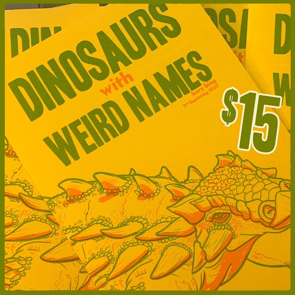 A 3-color risograph zine about dinosaurs that had weird names. What's that? You say every dinosaur has a weird name? Well THESE dinosaurs have even WEIRDER names. Did you know there's one named after Elvis? You should buy this zine to learn more.