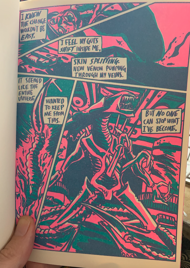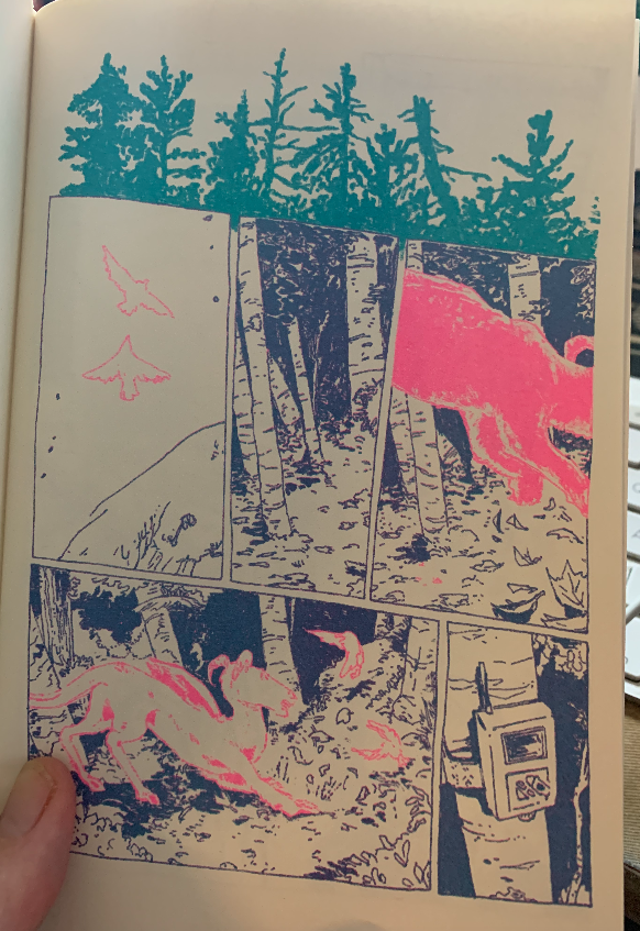 Each zine is made with fluorescent pink and teal risograph ink! Pictures don't do it justice!