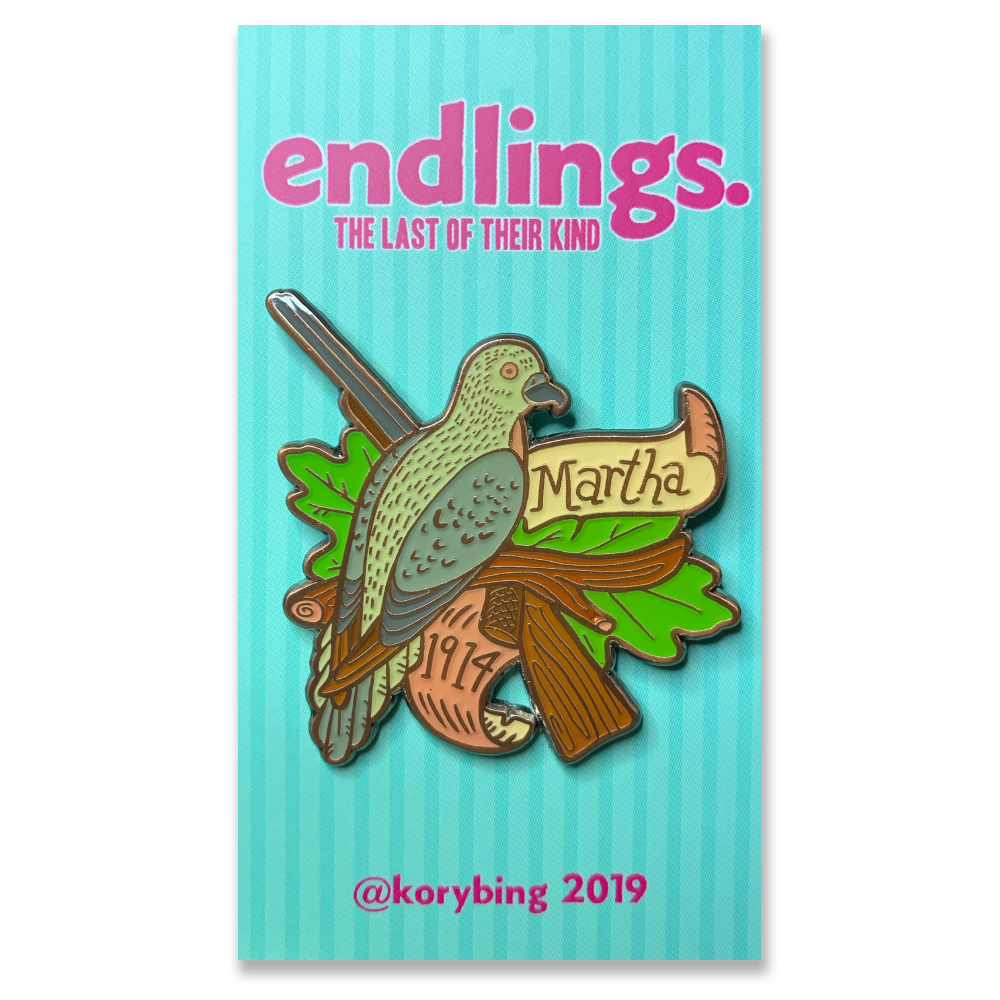 Martha, the last Passenger Pigeon: shown in front of oak leaves and a pigeon gun, invented specifically to hunt passenger pigeons. Martha's pin will be soft enamel, antique copper-plated, made with 9 enamel colors, and measuring 1.75" wide.
