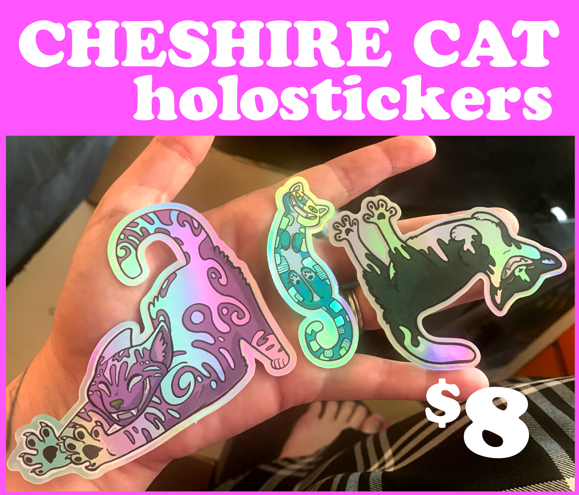 A sticker pack of three holographic cheshire cat stickers! They're little guys!