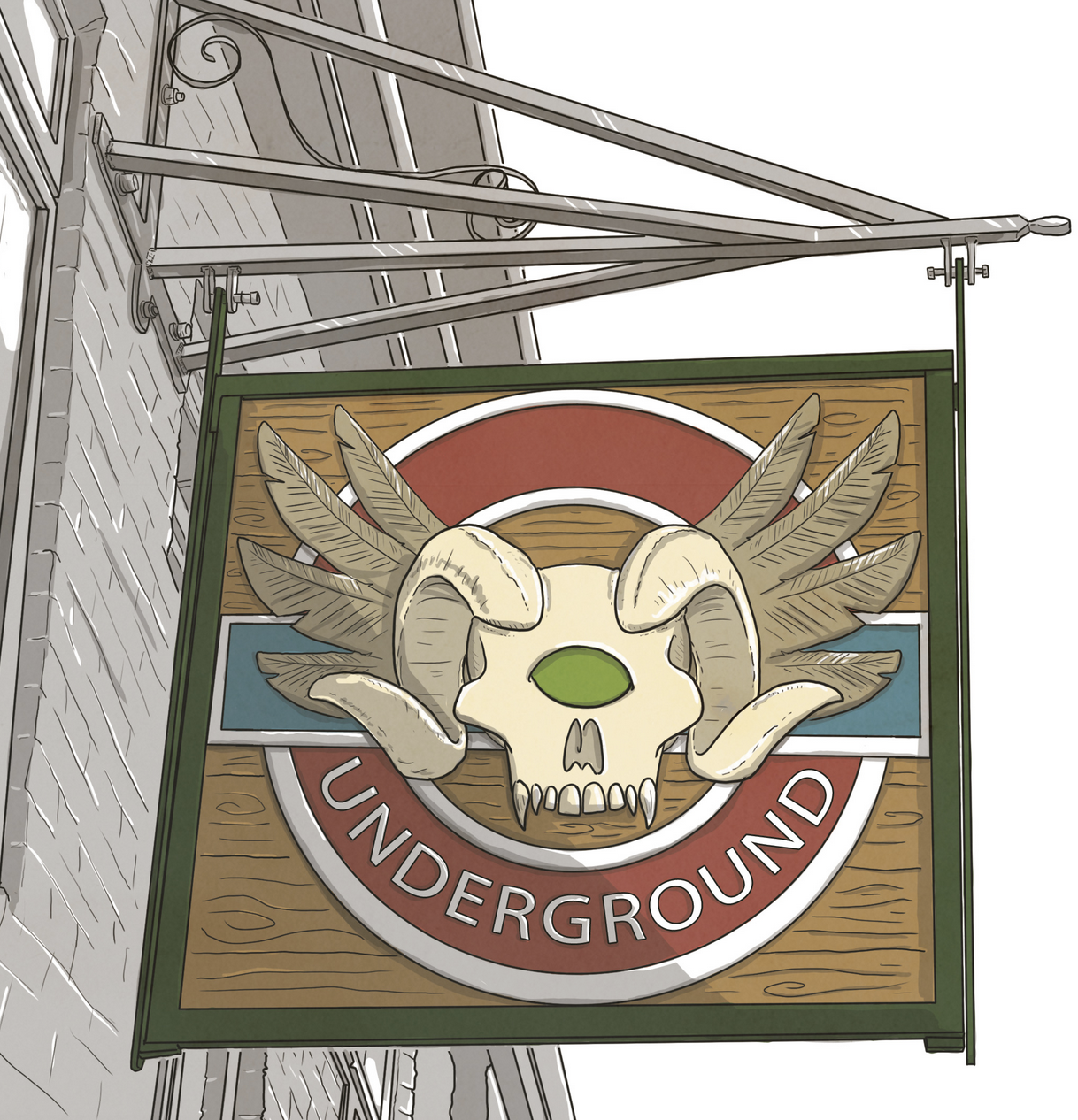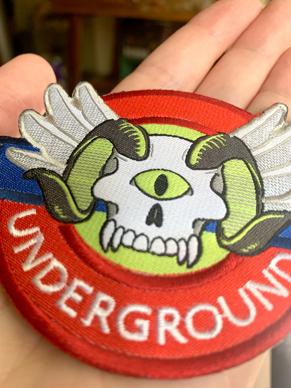 Iron-on embroidered patch of the logo for the Underground, the hidden bar and nightclub in the Liverpool Avalon from the webcomic Skin Deep! Read more at www.skindeepcomic.com