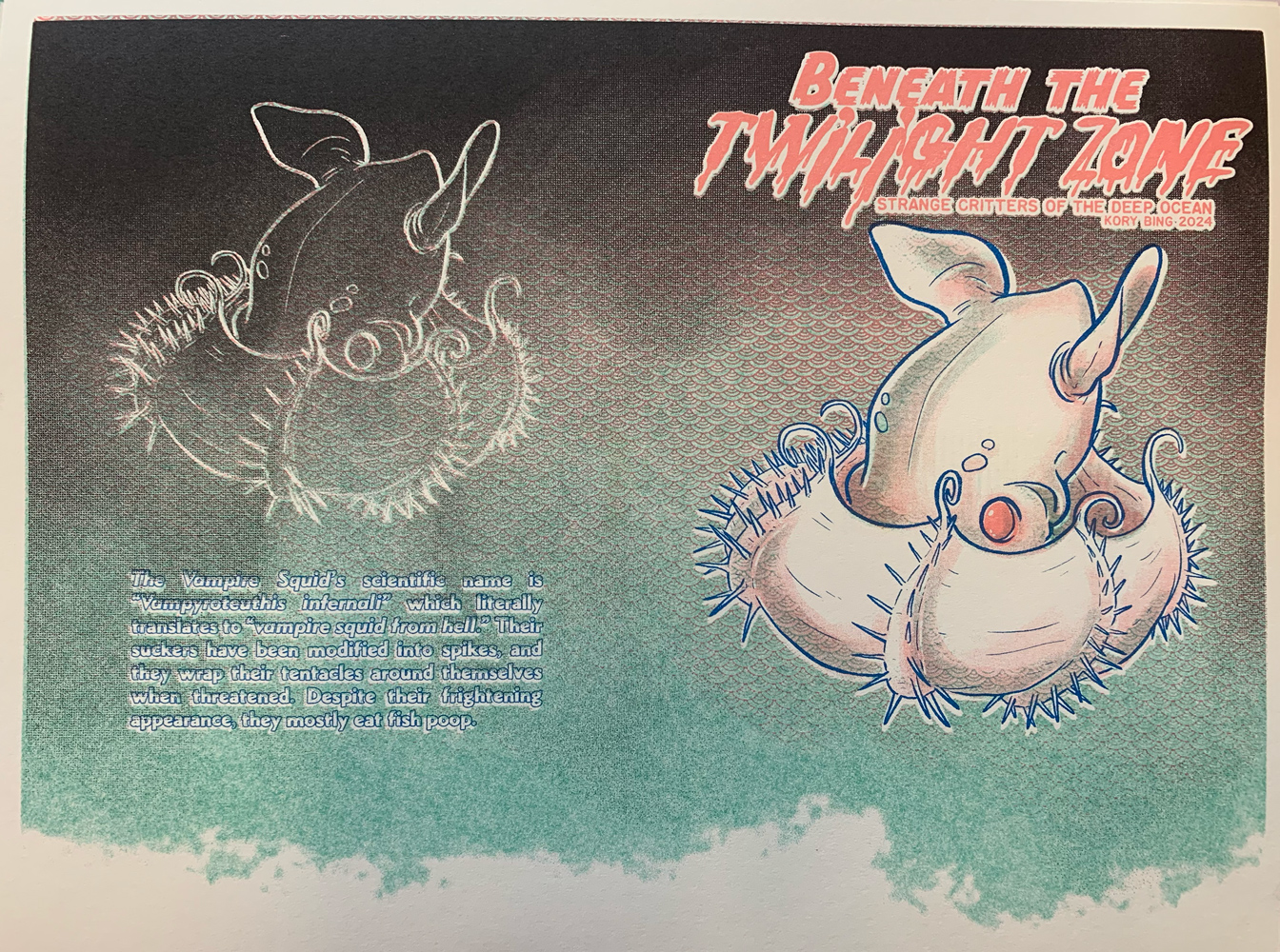 A 4-color risograph zine about various creatures that inhabit the deep ocean! Starting off fairly shallow and getting deeper and weirder as the zine progresses, you'll learn a lot about our mysterious ocean with this zine!! Hand-made at Outlet PDX in Portland, Oregon.