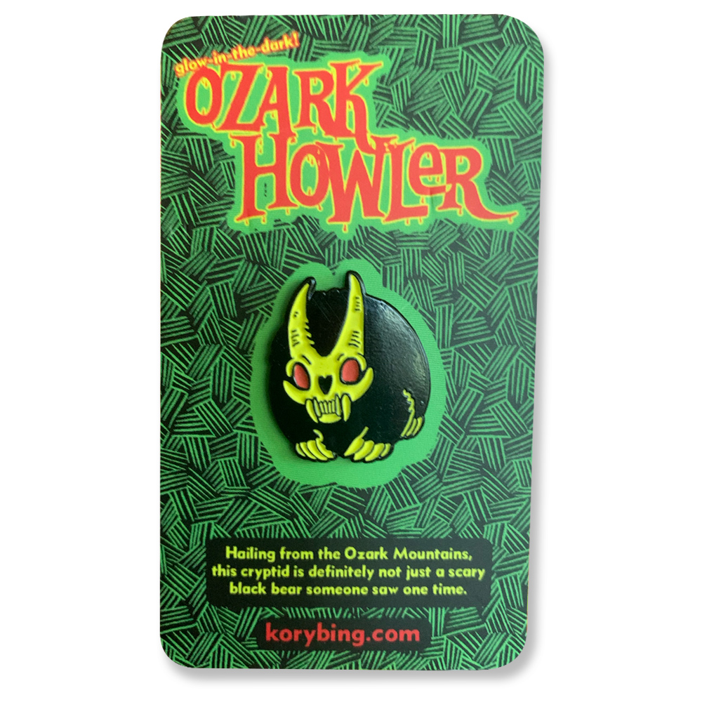 Enamel pin of the Ozark Howler from the webcomic Skin Deep. Hard enamel with glow-in-the-dark enamel! It glows REAL GOOD.