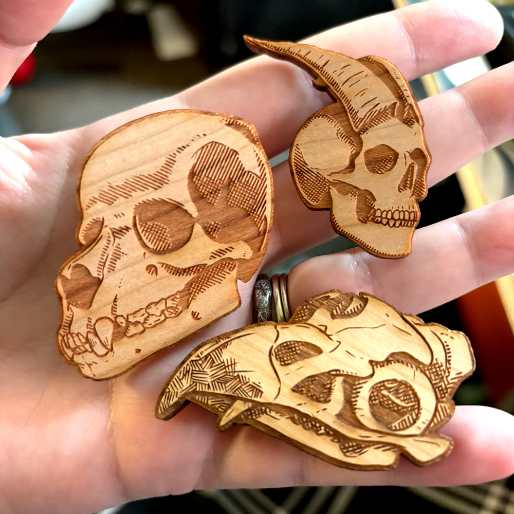 Wooden pins of various mythical creature skulls! Choose between sphinx, gryphon, satyr, or all three! Made of sustainable cherry wood and manufactured in the USA!